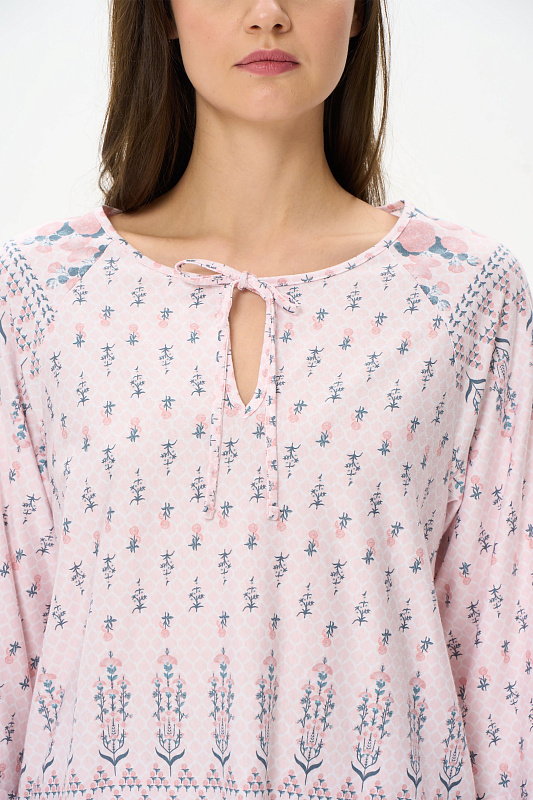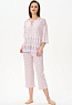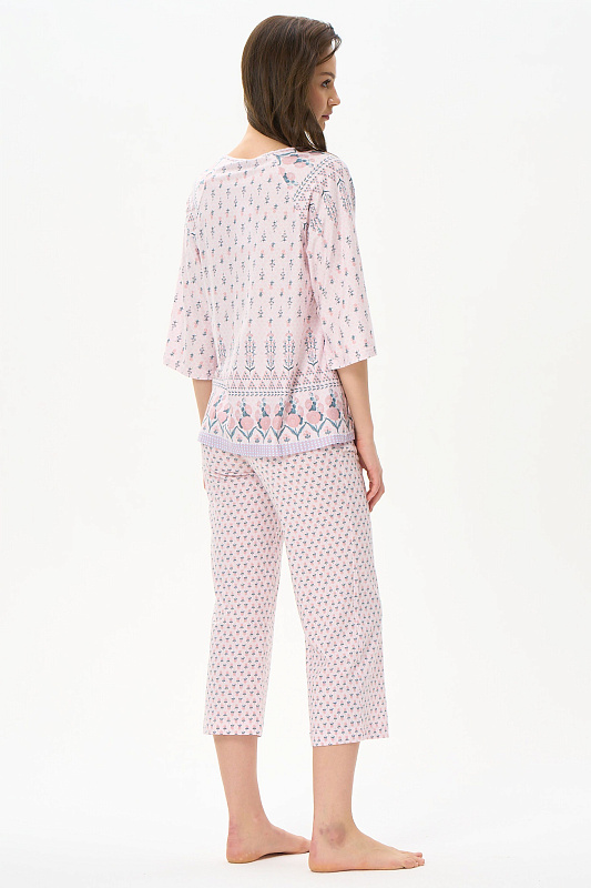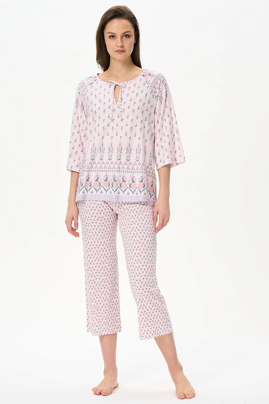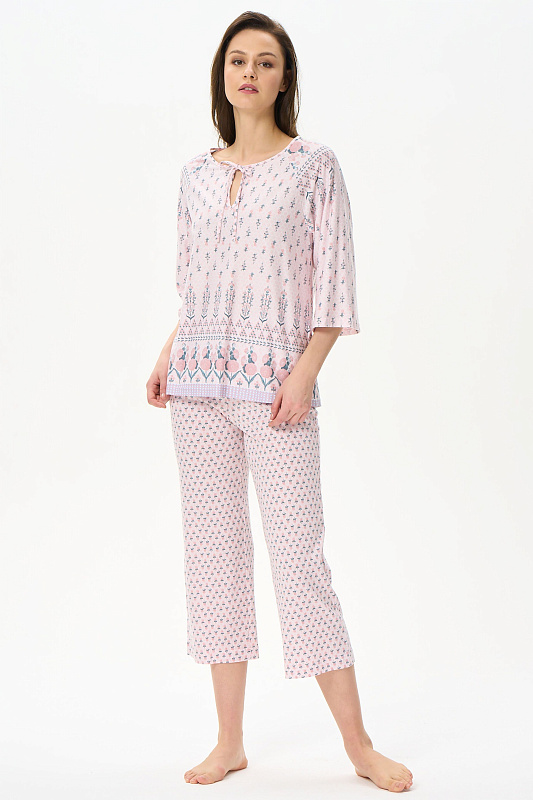 Пижама с бриджами выполнена из хлопкового трикотажного полотна с вискозой. Блузка свободного силуэта, круглый вырез горловины, рукава реглан 3/4. Прямые бриджи с карманами, пояс с эластичной тесьмой внутри. Рост модели на фото 170см.