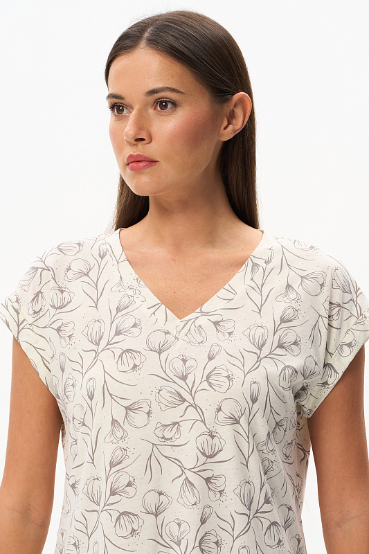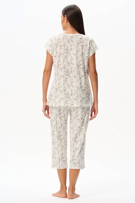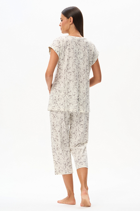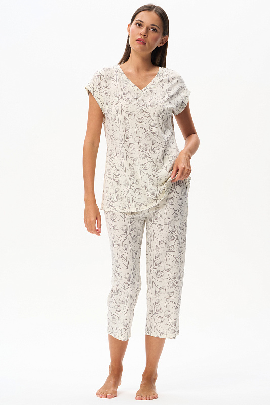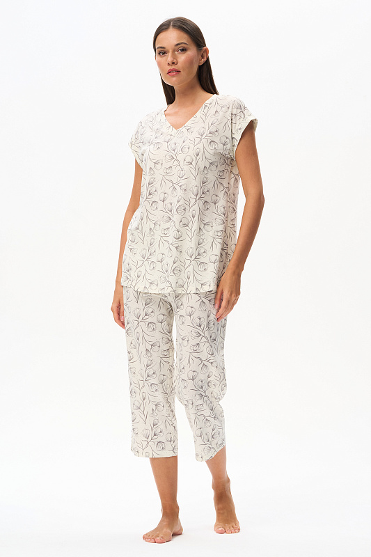 Пижама из кулирки качества пенье 110 гр. Дизайнерский рисунок Контурная цветочная графика - Распускающиеся бутоны в оттенке Перламутровое облако на Сливочном фоне. Блуза свободного кроя, удлинённая, красивый V-образный вырез горловины обработан планкой. Цельнокроеные короткие рукава с притачными манжетами. Брюки укороченные свободные с мягкой резинкой по талии. Модель для комфортного сна, позволяет коже дышать и очень приятная к телу. Рост модели 175 см.