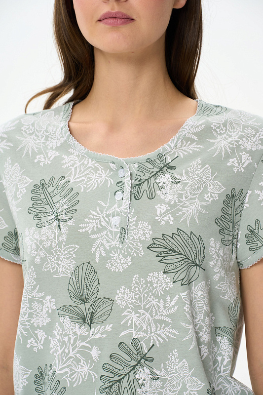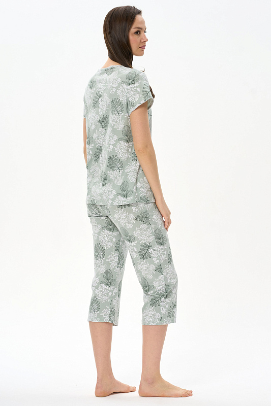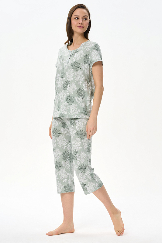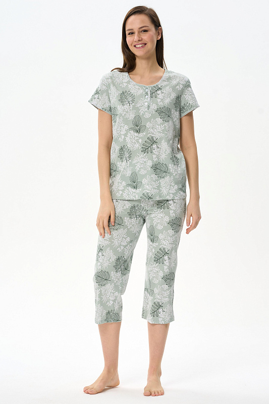 Пижама из хлопкового полотна. Верх свободного силуэта, круглый вырез горловины с застежкой на пуговицы, втачные короткие рукава. Вырез горловины и низ рукавов декорированы фестонами контрастного цвета. Прямые бриджи, пояс на резинке. Рост модели на фото 177