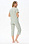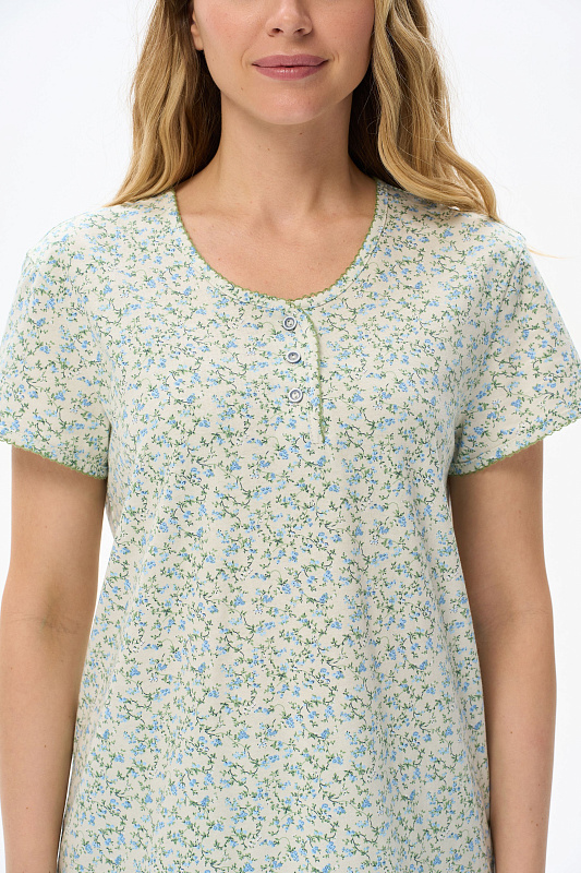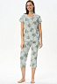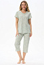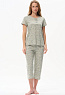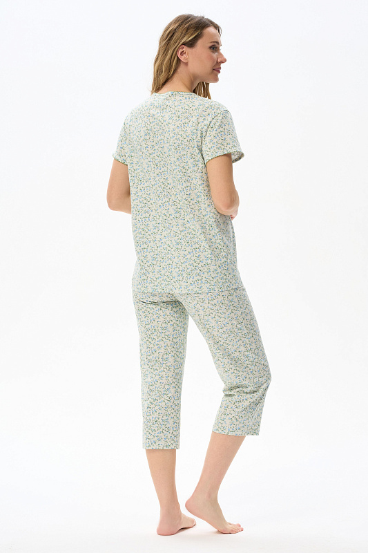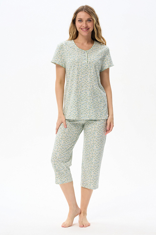 Пижама из хлопкового полотна. Верх свободного силуэта, круглый вырез горловины с застежкой на пуговицы, втачные короткие рукава. Вырез горловины и низ рукавов декорированы фестонами контрастного цвета. Прямые бриджи, пояс на резинке. Рост модели на фото 175см