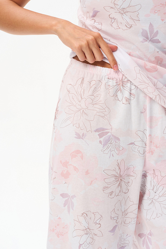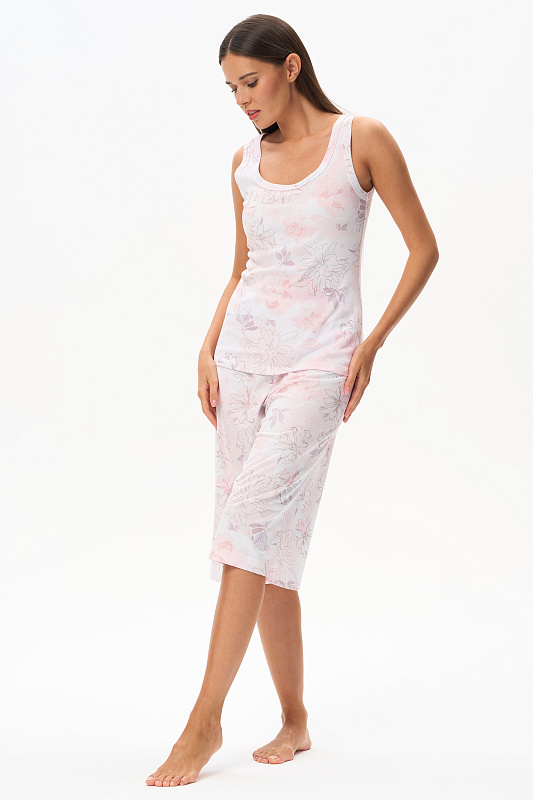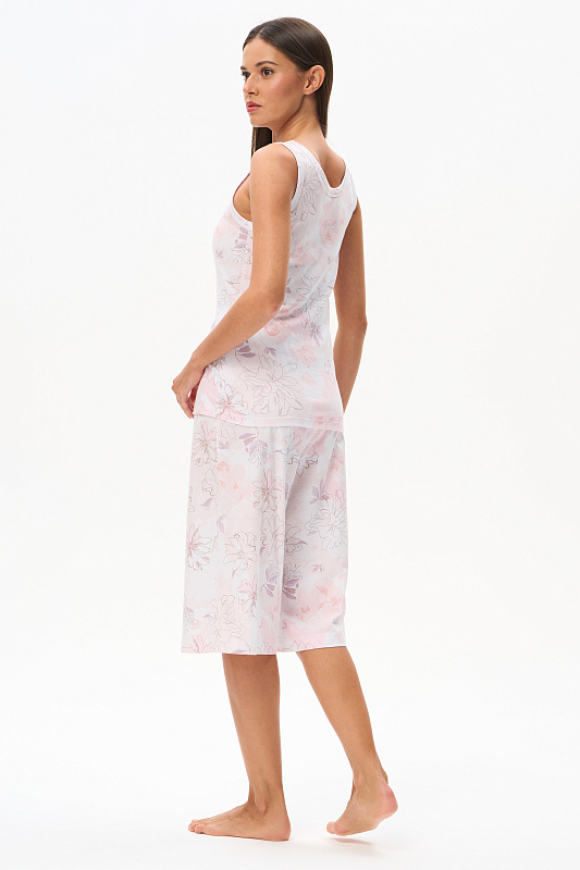 Пижама: комфортная майка с широкими бретелями из хлопковой рибаны качества пенье 165 гр и свободные бриджи из кулирки 150 гр. Модель можно носить как летний домашний костюм. Рост модели 175 см.