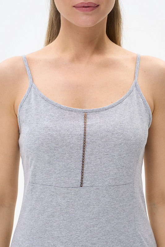 Пижама выполнена из хлопкового меланжевого полотна. Майка с круглым вырезом горловины. Спереди подрез и средний шов декорирован мережкой. Шорты без карманов, пояс с эластичной лентой внутри. Рельефные швы шорт декорированы мережкой. Рост модели на фото 175см.