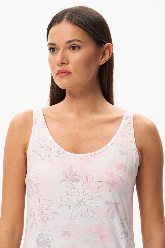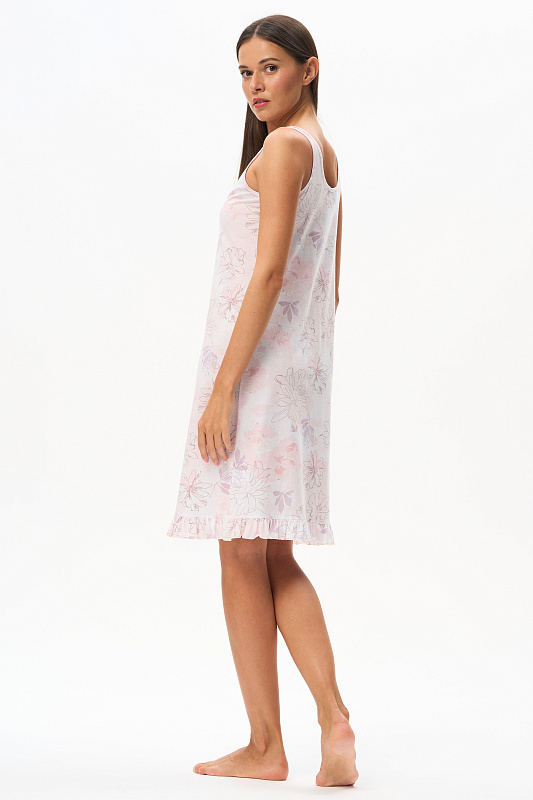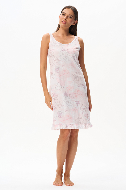 Женственная ночная сорочка из тончайшего длинноволокнистого хлопка качества пенье, нежная шелковистая, 110 гр. Модель длиной выше колен, полуприлегающего силуэта с узкой оборкой по низу. Украшением сорочки служит изящный дизайнерский рисунок полотна - Акварельный цветочный принт с тонкими изящными линиями в нежных розовых тонах и оттенке мокко. Рост модели 175 см.
