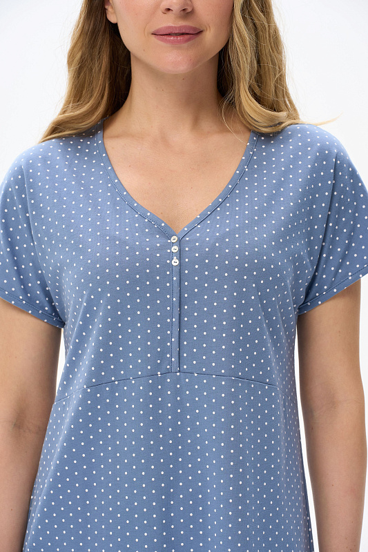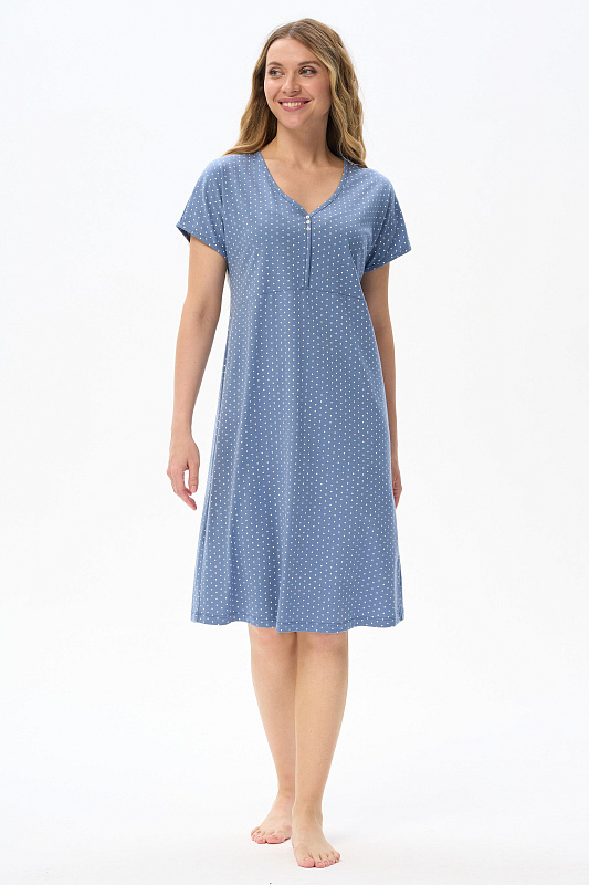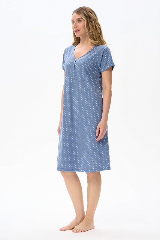 Ночная сорочка А-образного силуэта из хлопкового полотна. V-образная горловина с декоративными пуговицами. Короткий рукав - реглан. Длина изделия ниже колена. Рост модели на фото 170см.