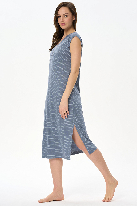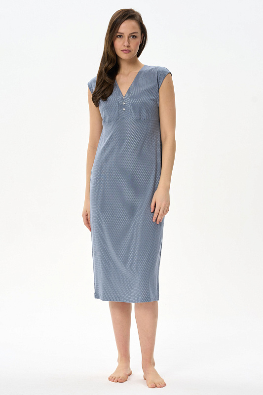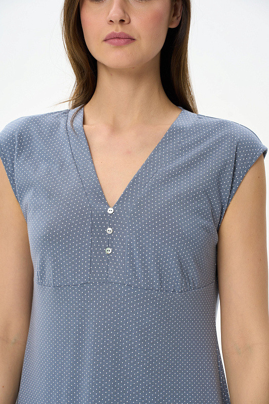 Сорочка прилегающего силуэта из хлопкового полотна с вискозой. V- образная горловина оформлена планкой с декоративными пуговицами. Благодаря подрезу под грудью фигура смотрится стройнее. В боковом шве разрез. Длина изделия ниже колена. Рост модели на фото 178 см.