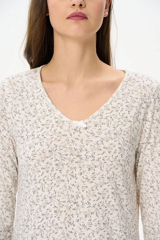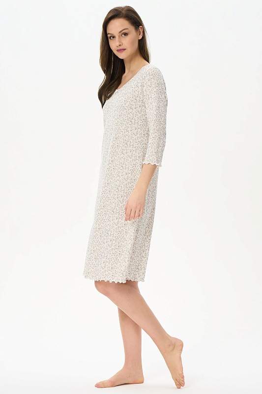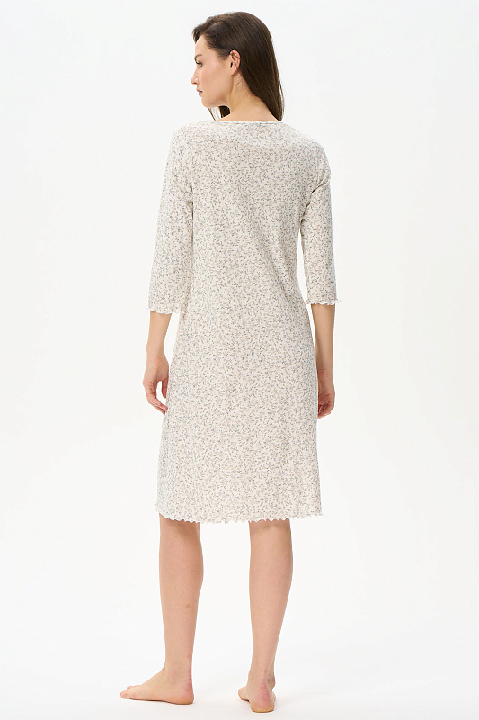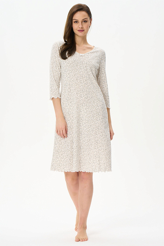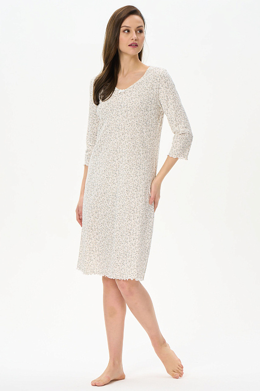 Ночная сорочка полуприлегающего силуэта, выполнена из хлопкового трикотажного полотна - рибана. V-образный вырез горловины. Втачные рукава длиной чуть ниже локтя. Длина изделия ниже колен. Рост модели на фото 178см.