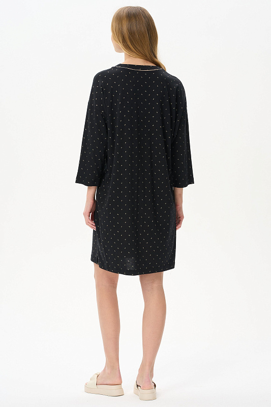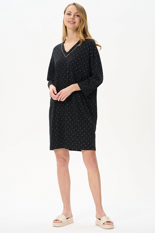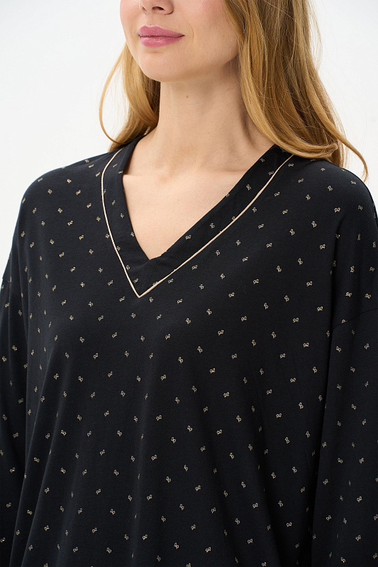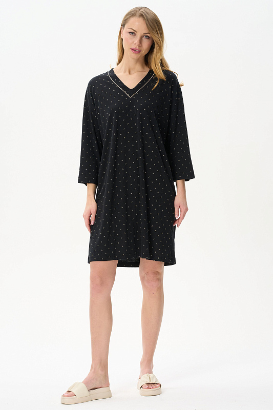 Сорочка свободного силуэта из хлопкового полотна с вискозой. V-вырез горловины, длинные втачные рукава. Длина изделия ниже колена. Рост модели на фото 170