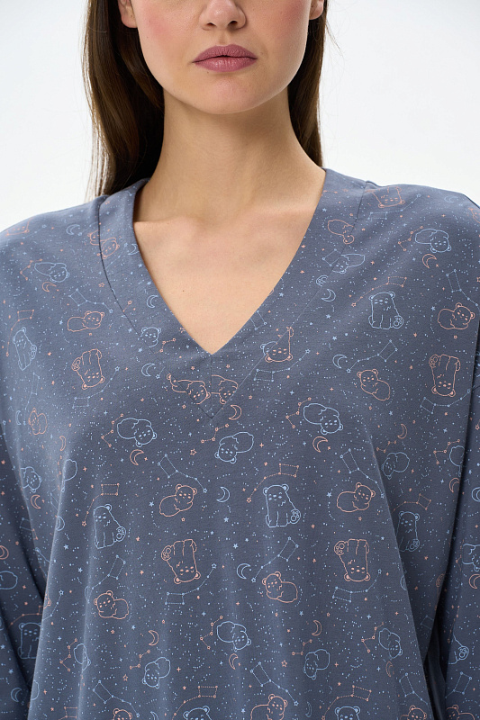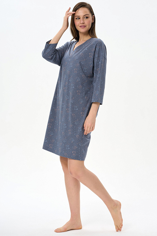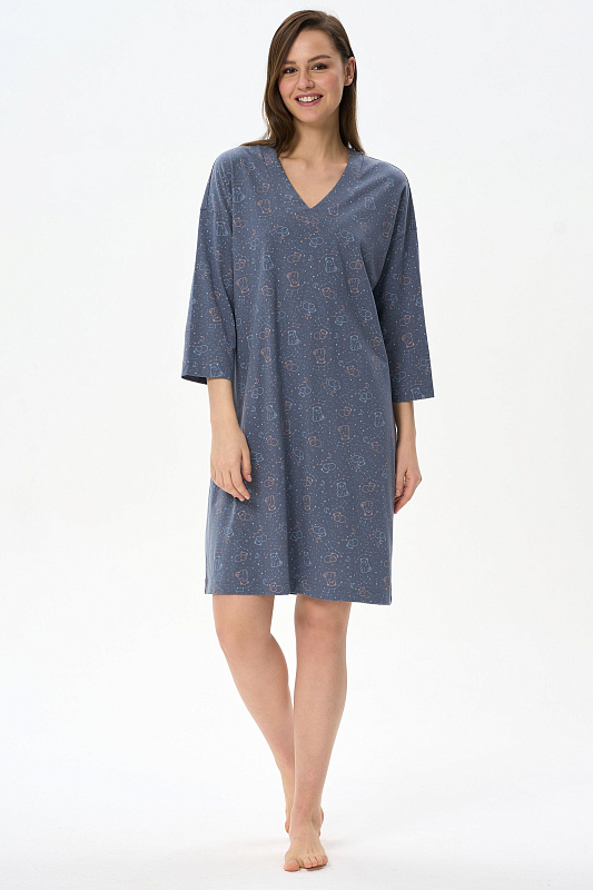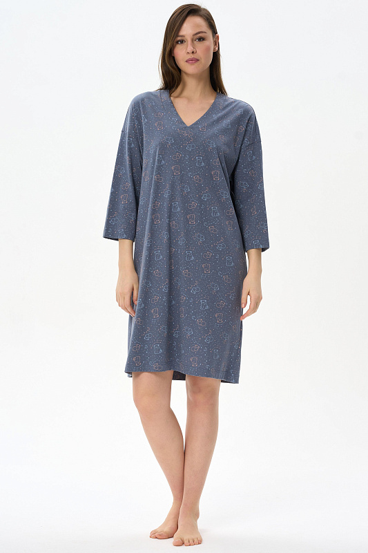 Сорочка свободного силуэта из хлопкового полотна. V-образный вырез горловины, длинные втачные рукава. Длина изделия до колена. Рост модели на фото 178 см
