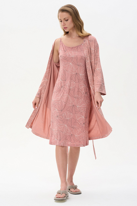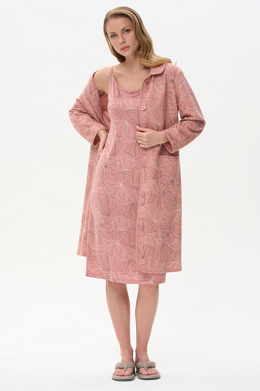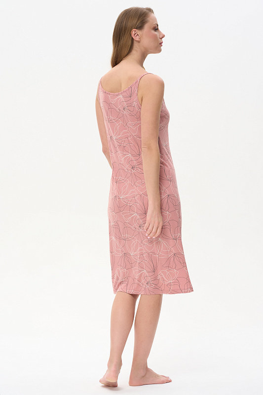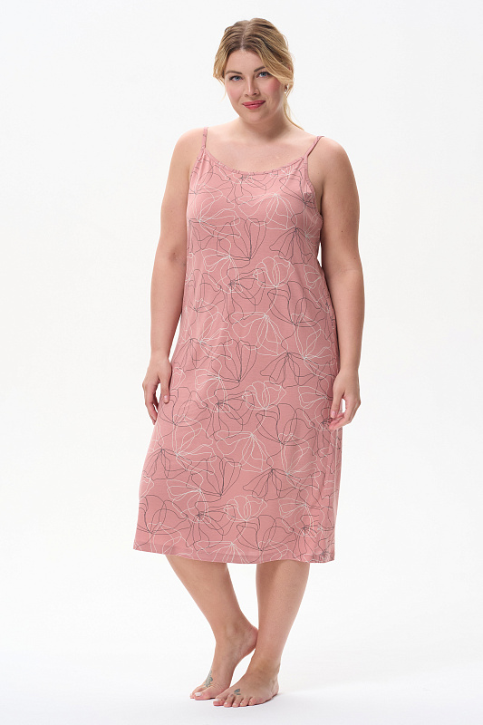 Сорочка из мягкого, шелковистого вискозного полотна 160 гр. тонкие, изящные цветы молочного и графитового оттенков на коралловом фоне. Модель на тонких бретелях, полуприлекающего силуэта, вырез оформлен тонкой бейкой, длина ниже колен. Сорочка подчёркивает женственность, нежно прилегает к телу, создавая ощущение лёгкости. Рост модели 175 см .
