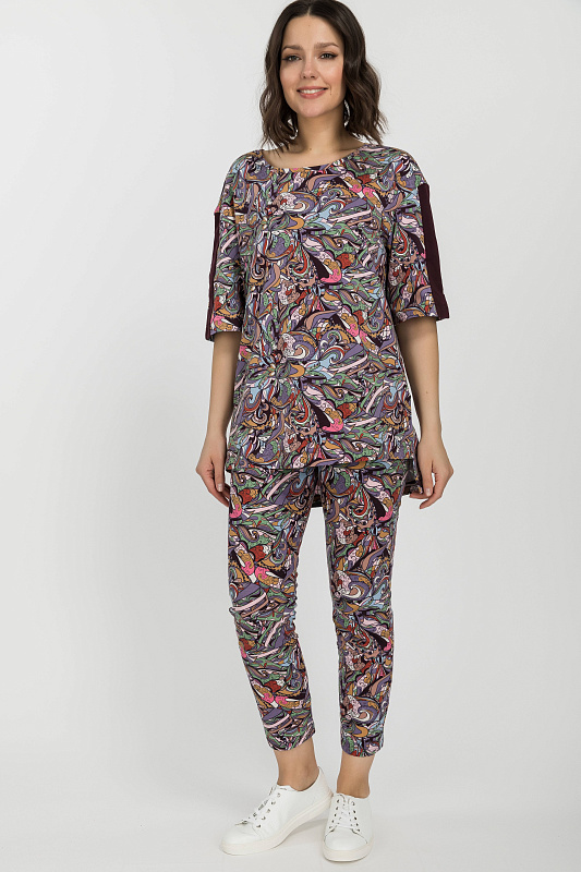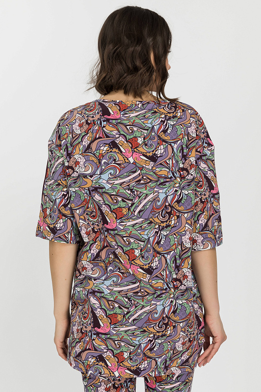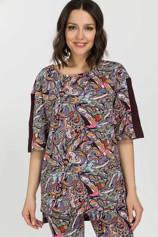 Комфортная туника прямого силуэта, выполнена из хлопкового трикотажного полотна с эластаном. Спущенная линия плеча , рукав до линии локтя с ярким лампасом. Удлиненная спинка и по низу в боковых швах разрезы. Рост модели 175.