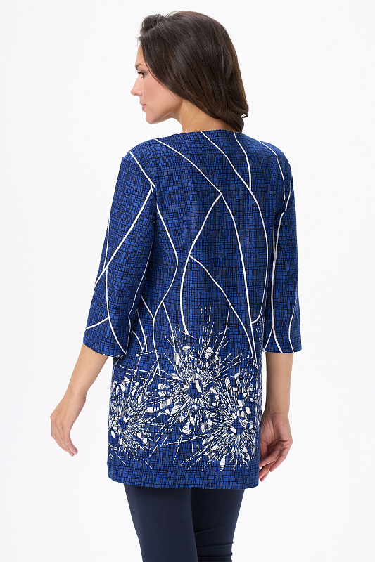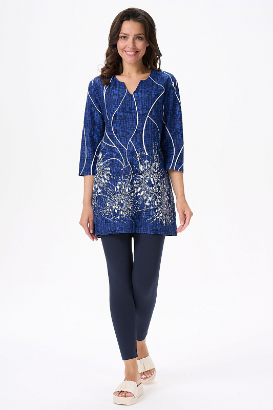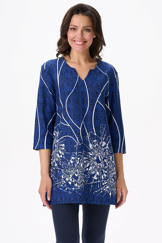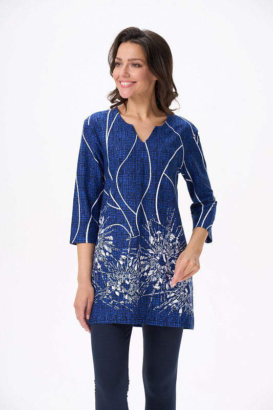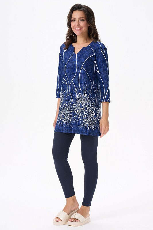 Туника расширенного силуэта из хлопкового трикотажного полотна. Фигурный вырез горловины, втачные рукава длинной чуть ниже локтя. Рост модели на фото 170.