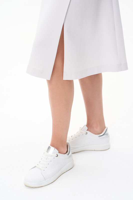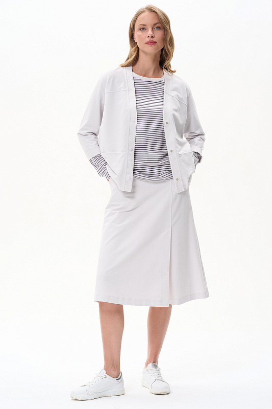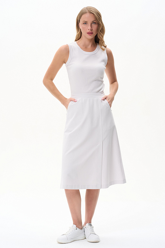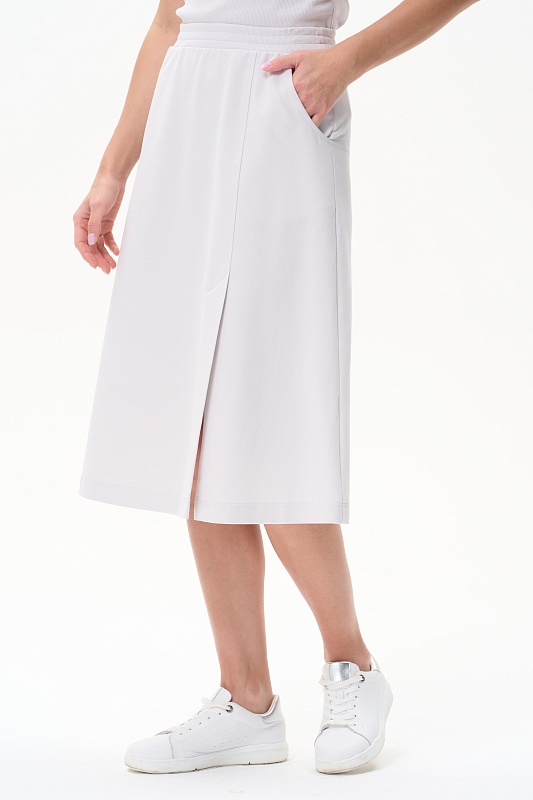 Эффектная юбка А-силуэта в трендовом Жемчужном оттенке, длиной до середины икр с асимметричным швом спереди и высокой шлицей. Удобные фигурные карманы, пояс с эластичной лентой внутри. Рост модели 175 см