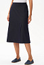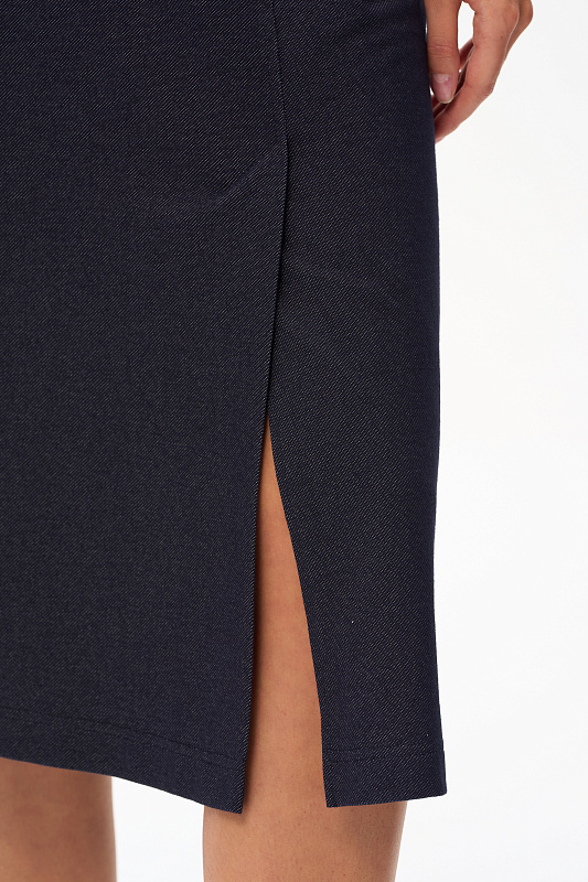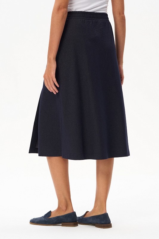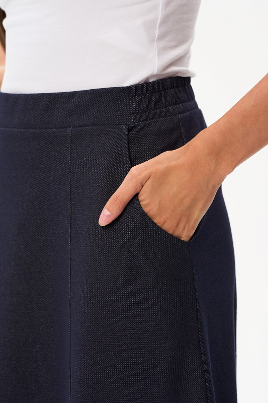 Эффектная юбка А-силуэта в глубоком синем оттенке, длиной до середины икр, с асимметричным швом спереди и высокой шлицей. Удобные фигурные карманы, пояс с эластичной лентой внутри. Рост модели 175 см