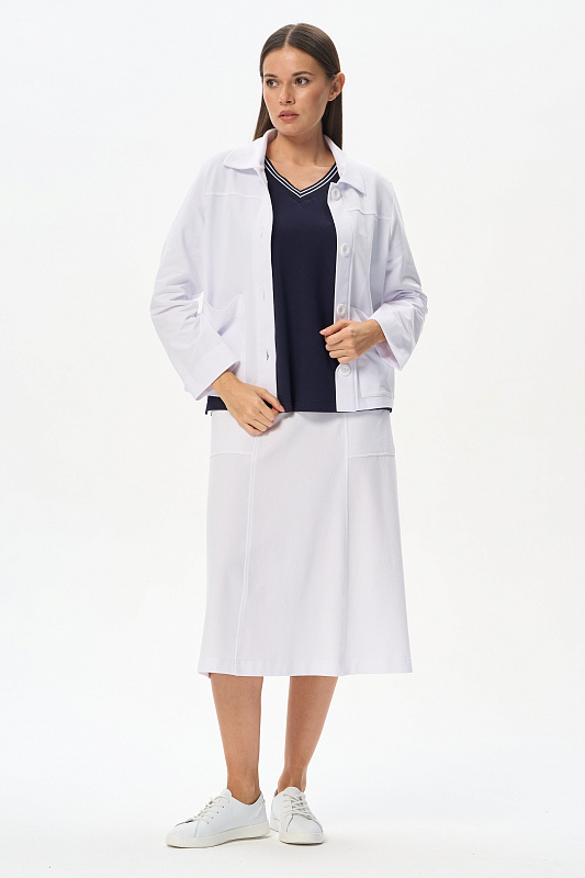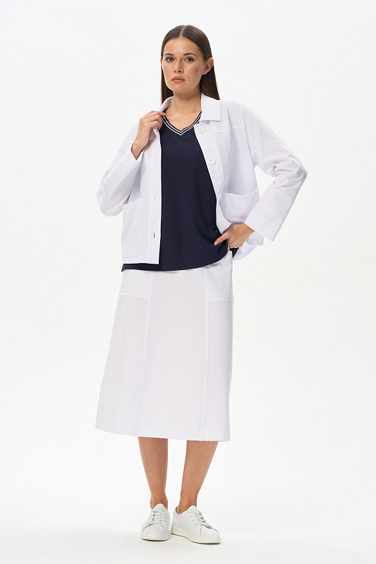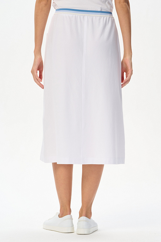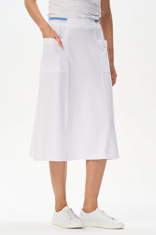 Эффектная юбка А-силуэта из тонкого джинскотта 165 гр в чистом белом оттенке. Модель длиной до середины икр, с рельефами и удобными карманами, пояс с декоративной эластичной лентой в полоску. Лёгкая, комфортная модель для лета. Рост модели 175 см