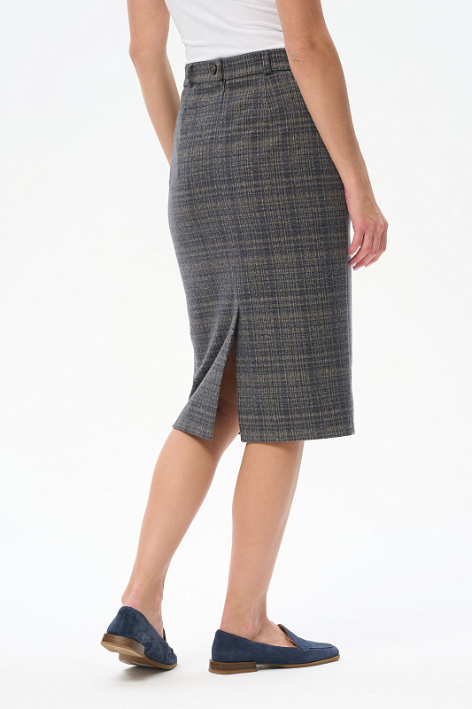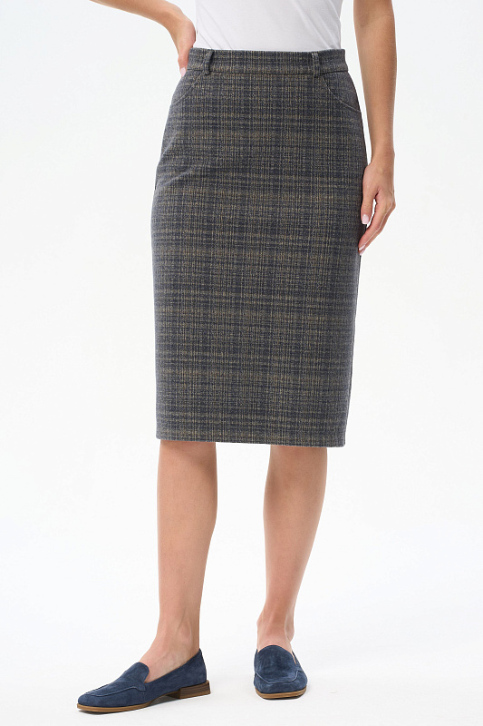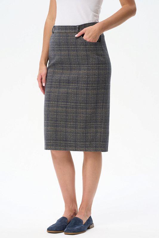 Класическая юбка со шлицей на подкладке выполнена из плотного вискозного жаккардового полотна. Спереди кокетка и карманы, сзади застежка на потайную молнию. Длина изделия ниже колена. Рост модели на фото 178 см.