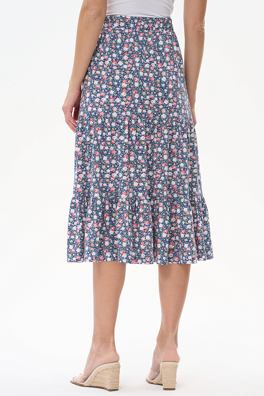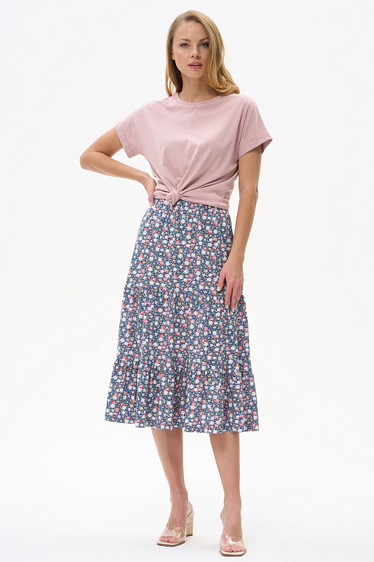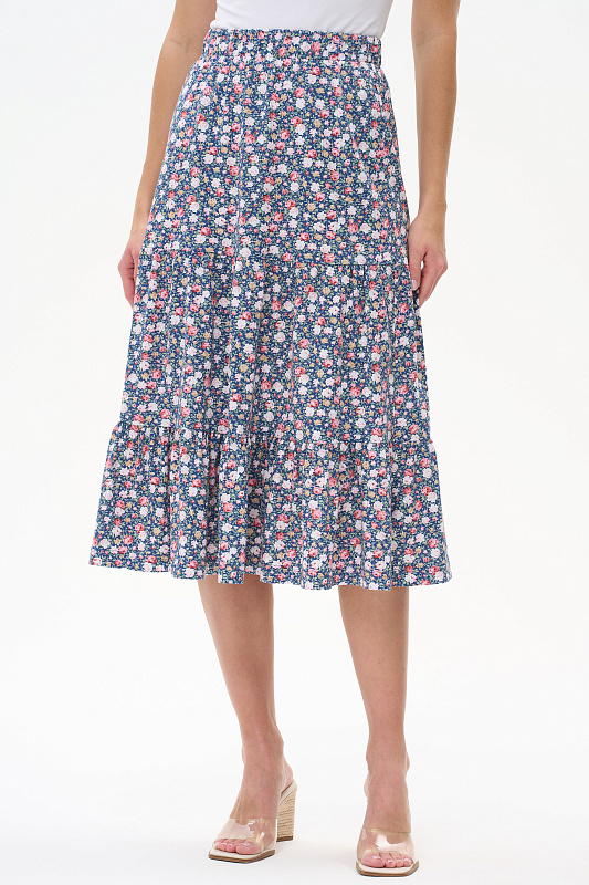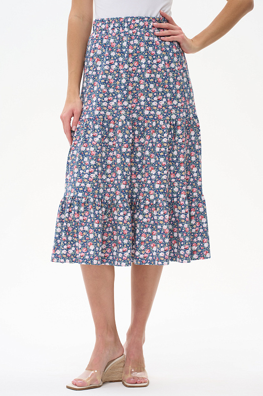 Ярусная юбка из кулирки качества ПЕ 150 гр. Модель свободная, силуэт лёгкая трапеция, пояс с эластичной лентой внутри, длина до середины икр. Комфортная юбка для города, дома и отдыха. Рост модели 175 см.