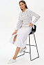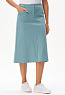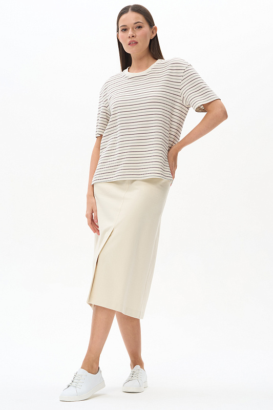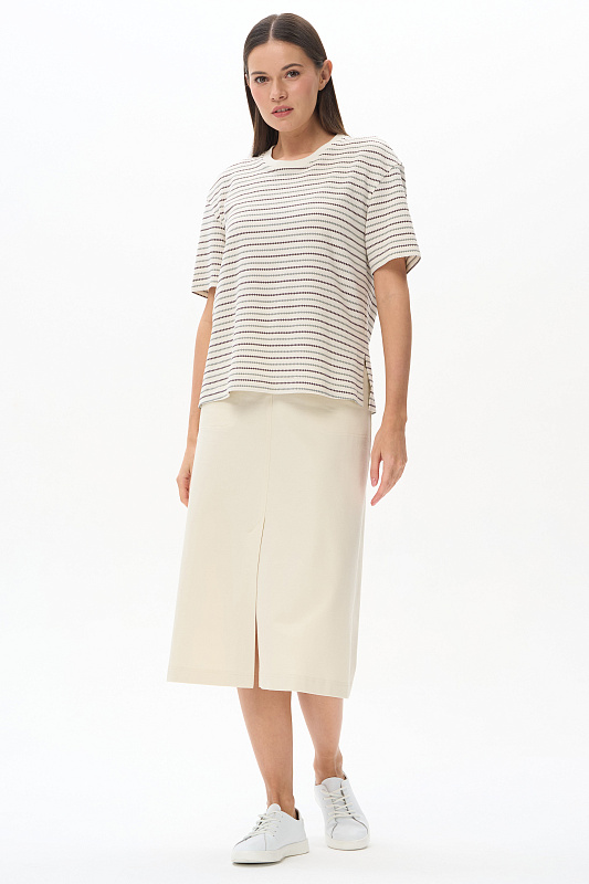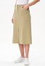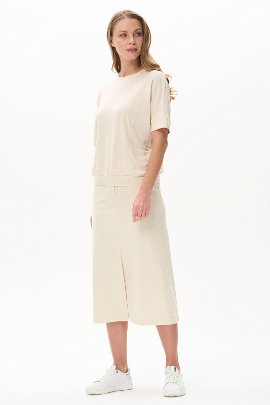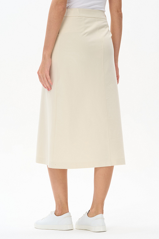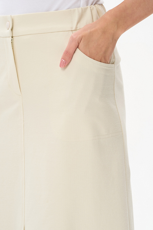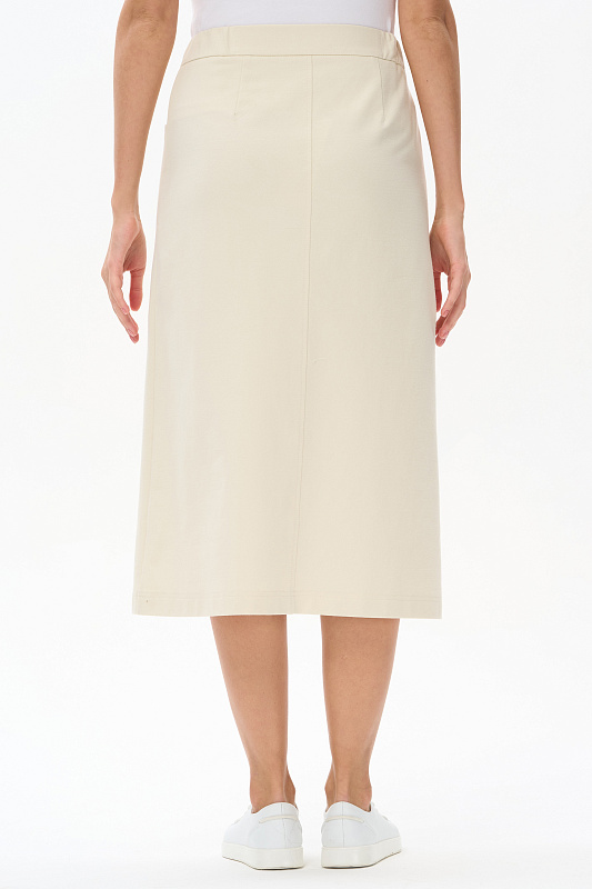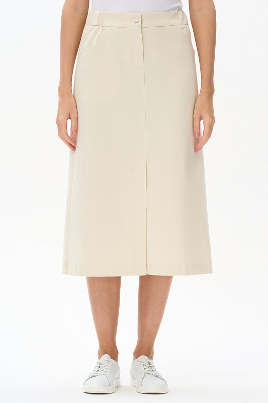 Юбка А-силуэта длиной до середины икр из джинскота 240 гр в трендовом оттенке Сливочный. В переднем шве высокая шлица, удобные фигурные карманы с отделочными строчками, застежка на молнию и кнопку. Модная юбка миди для офиса, отдыха и прогулок летними вечерами. Рост модели 175 см.