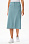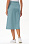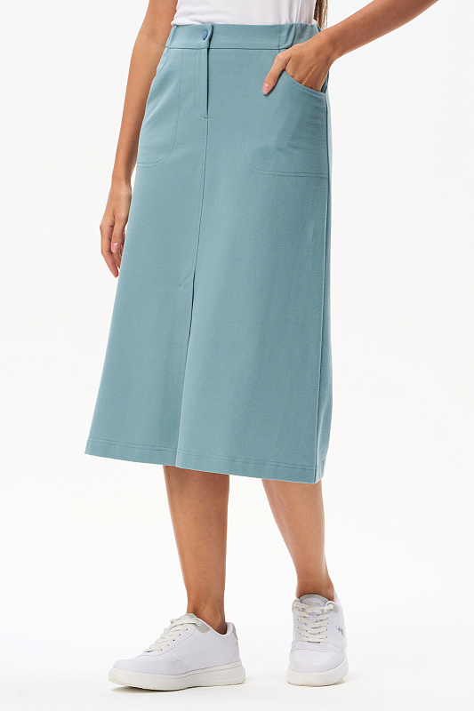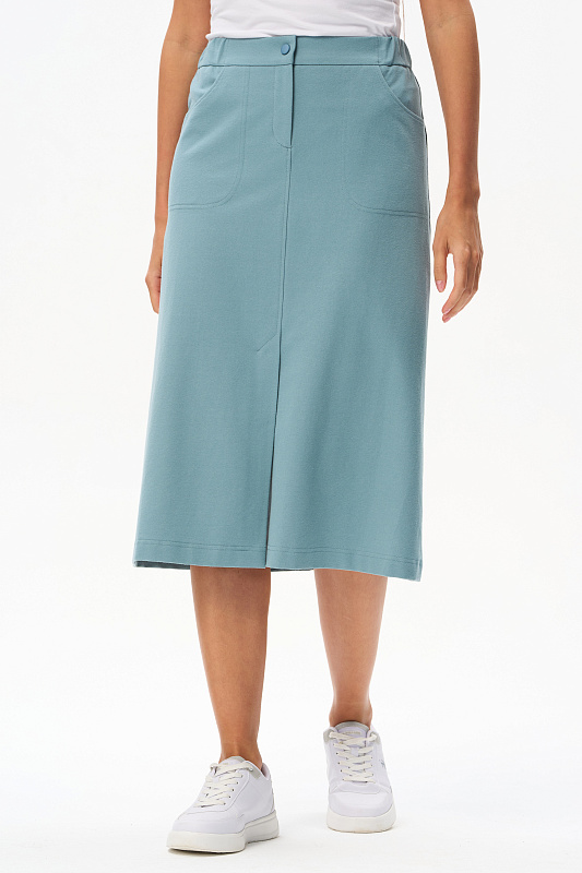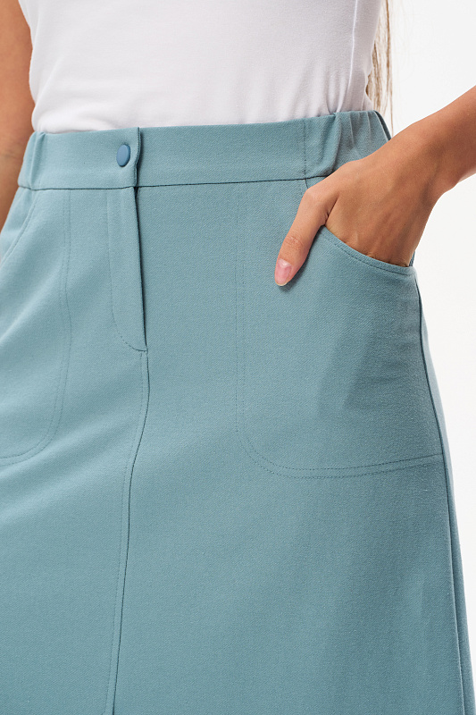 Юбка А-силуэта длиной до середины икр в трендовом оттенке Голубой дельфиниум. В переднем шве высокая шлица, удобные фигурные карманы с отделочными строчками, застежка на молнию и кнопку. Рост модели 175 см.