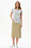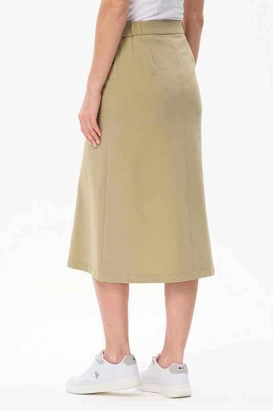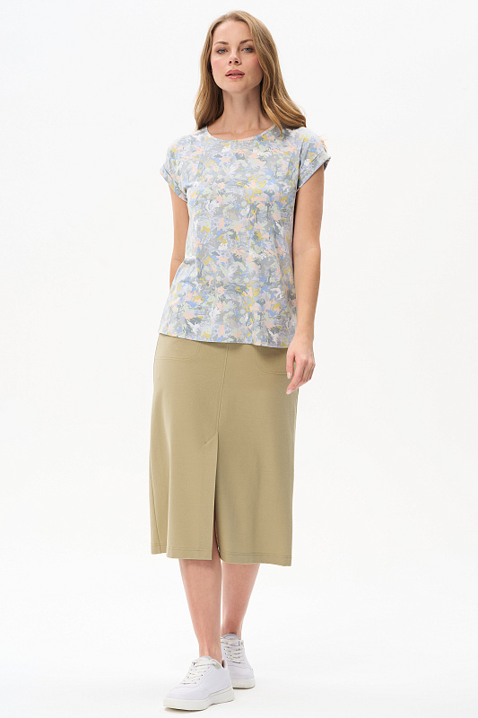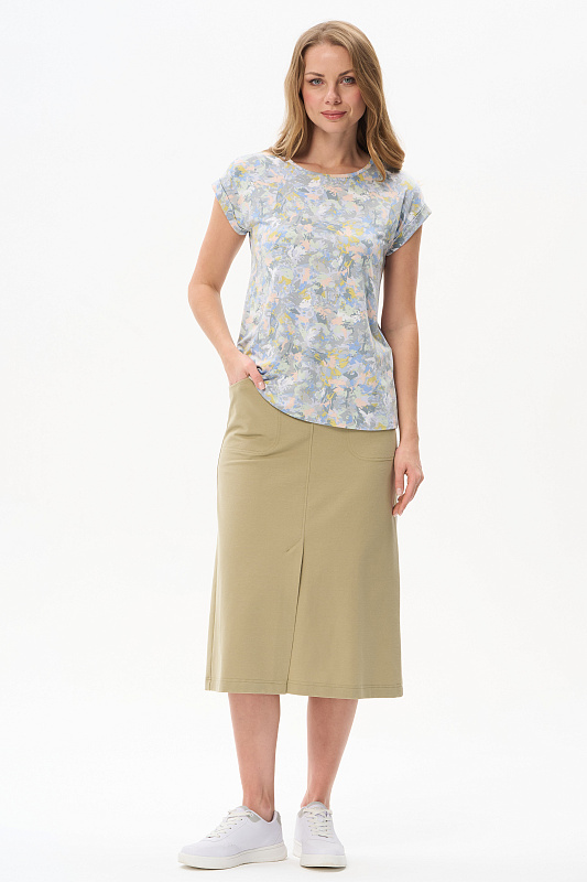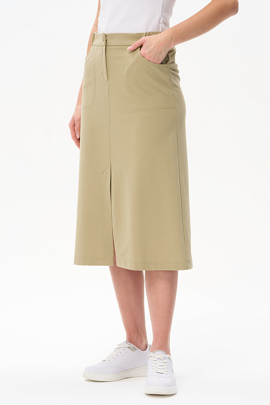 Юбка А-силуэта длиной до середины икр. В переднем шве высокая шлица, удобные фигурные карманы с отделочными строчками, застежка на молнию и кнопку. Рост модели 175 см.