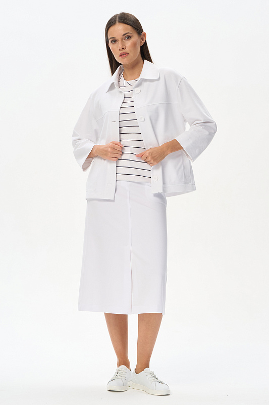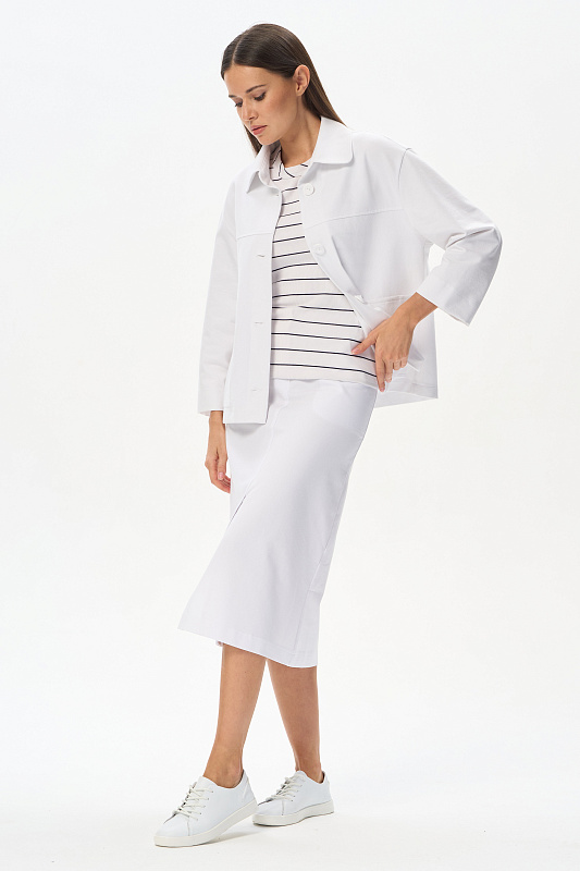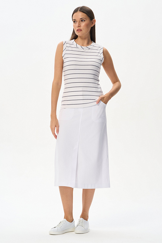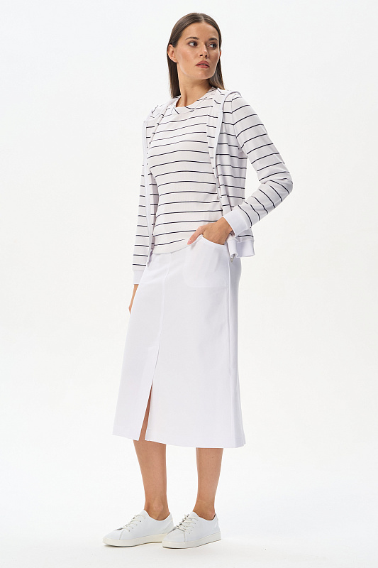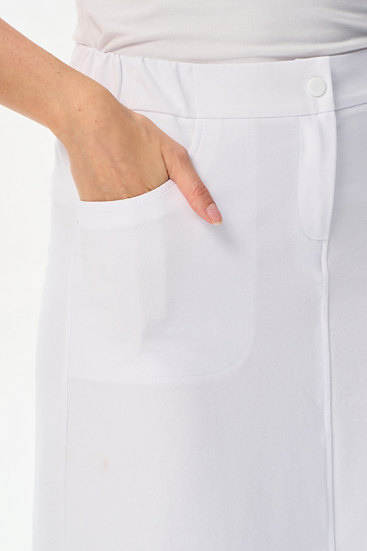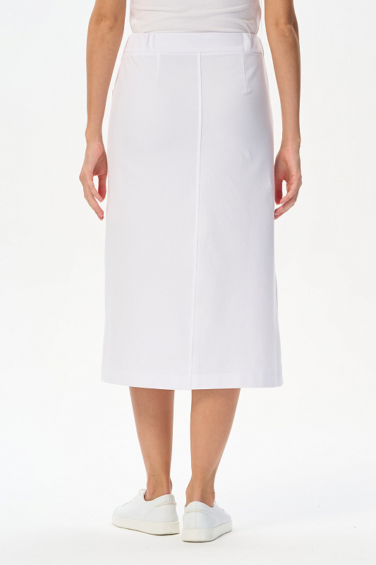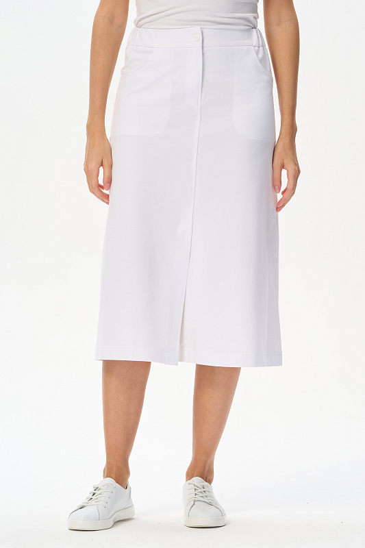 Юбка А-силуэта длиной до середины икр в чистом белом оттенке. В переднем шве высокая шлица, удобные фигурные карманы, застежка на молнию и кнопку. Идеальная модель для лета. Рост модели 175 см