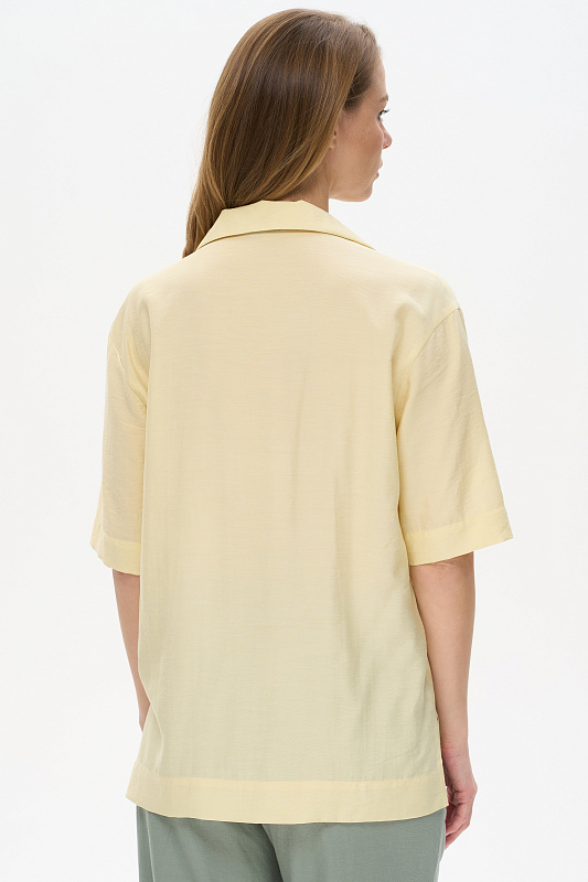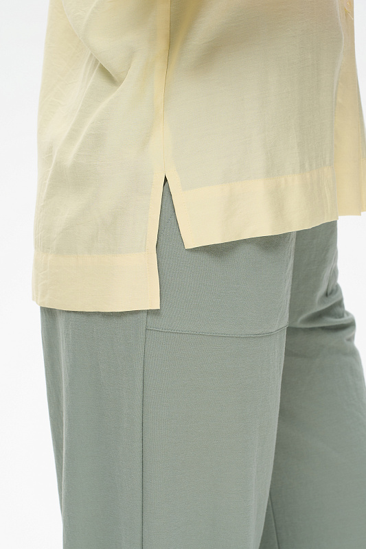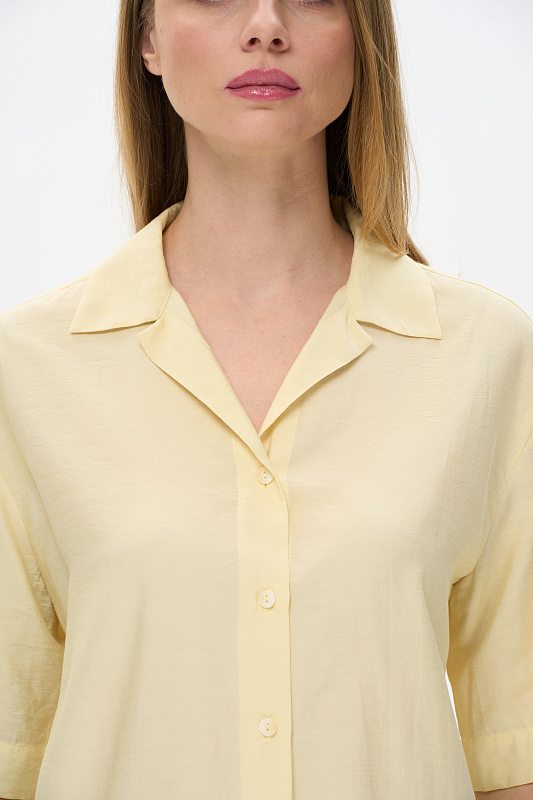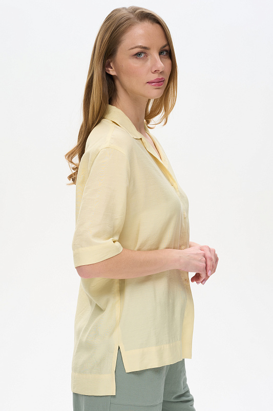 Блузка из лёгкой плательной ткани 120 гр в трендовом оттенке Лайм. Модель свободная, отложной воротник, застежка на пуговицы, рукава за локоть, с разным уровнем длины спинки и полочки - все, что требует летний офис. Рост модели 175 см