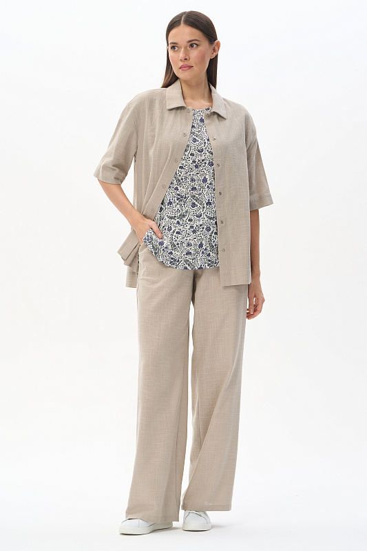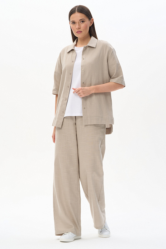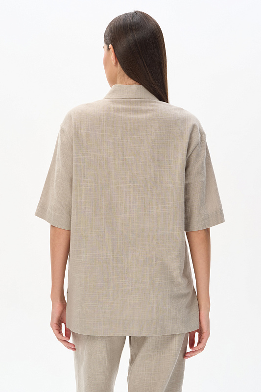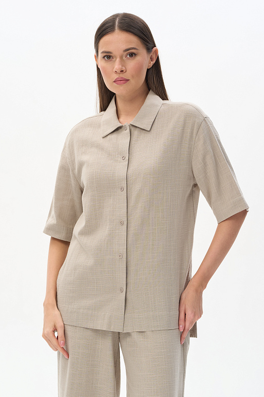 Рубашка из хлопковой фактурной ткани 120 гр в серо-зелёном оттенке. Модель свободная, прямого силуэта, отложной воротник, застежка на маленькие кнопки, рукава за локоть, с разным уровнем длины спинки и полочки. Рубашка-жакет идеальна для летнего сезона, подходит для офиса, сочетается с большим количеством моделей коллекции и позволяет создавть трендовые многослойные образы. Рост модели 175 см.