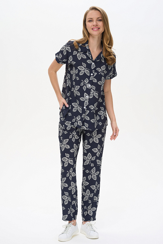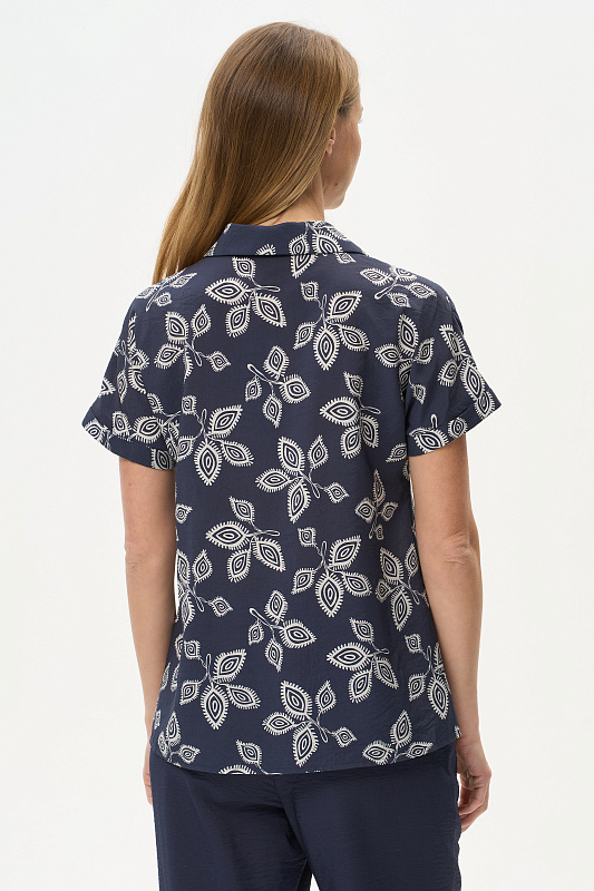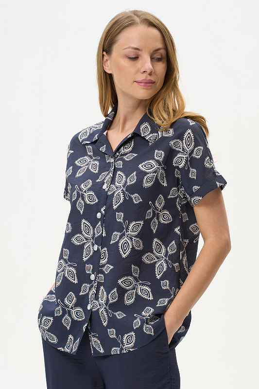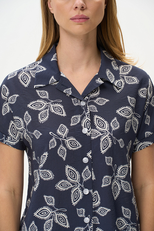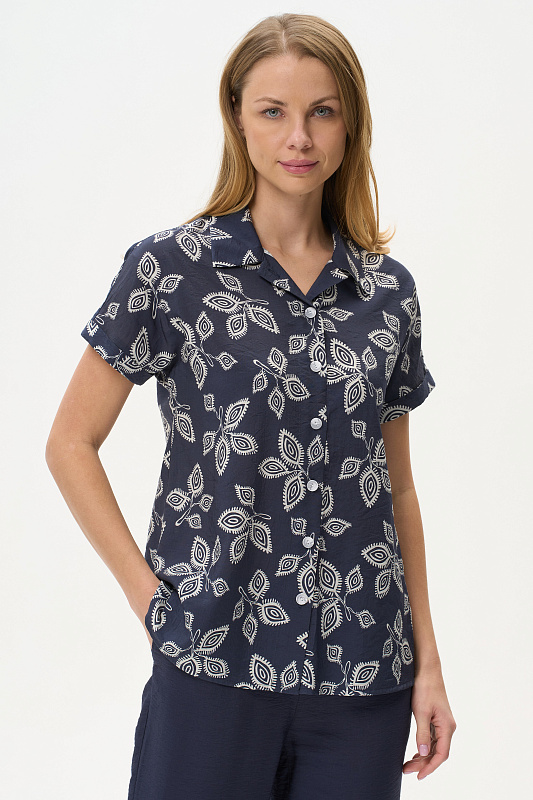 Блузка из вискозной ткани с эффектом жатости 120 гр. Светло-серая графика на глубоком синем. Модель свободная, прямого силуэта, с отложным воротником, цельнокроеные короткие рукава с зафиксированным подворотом, застёжка на пуговицы. Стильная свободная летняя блузка - отличный вариант для офиса, города, прогулок. В комплекте с брюками из той же ткани создают прекрасный вариант для летнего гардероба. Рост модели 175 см.