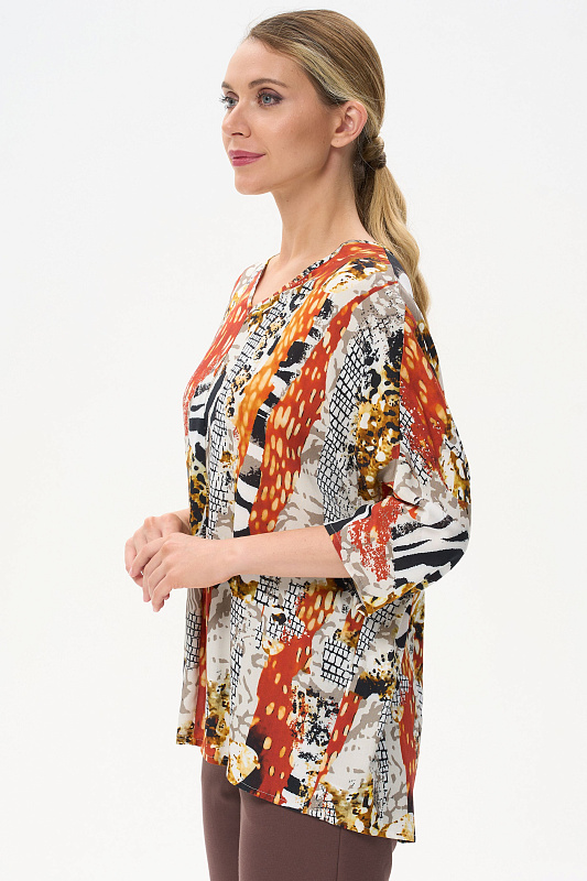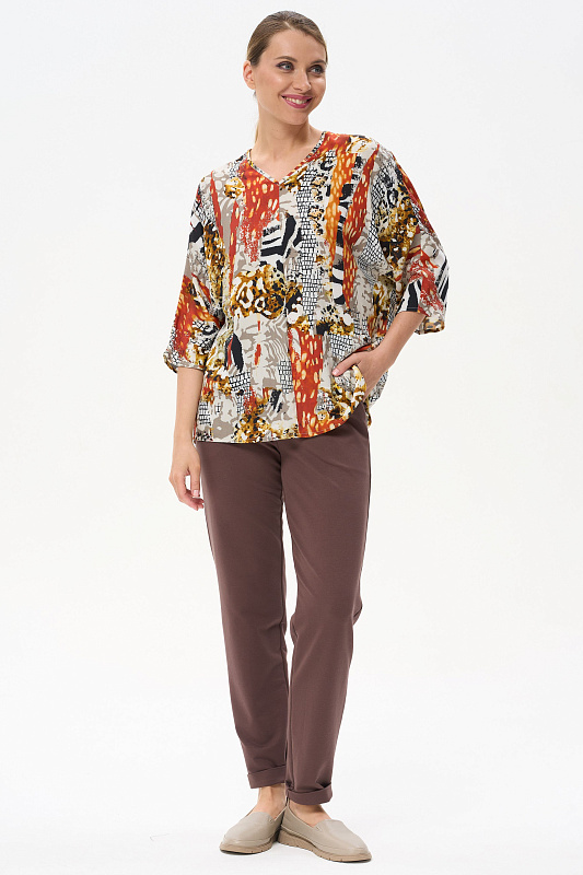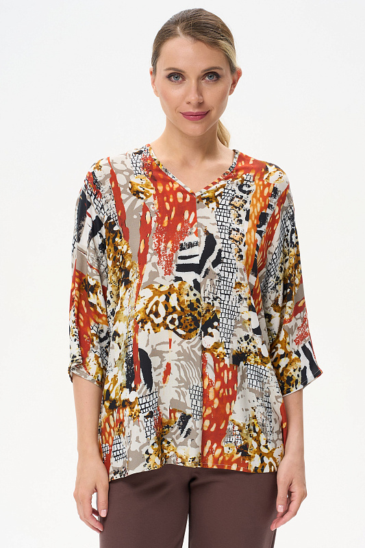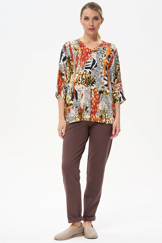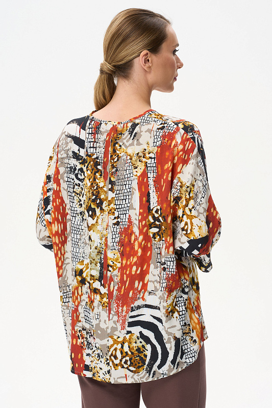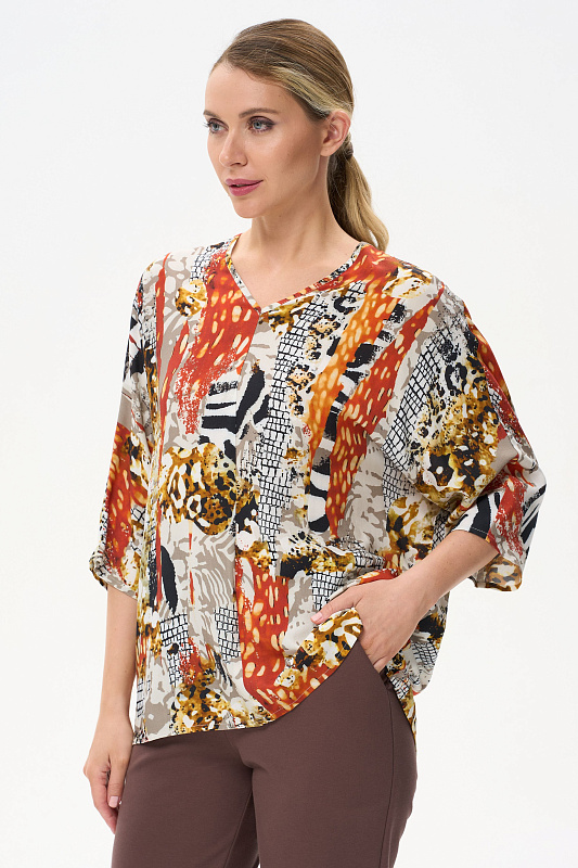 Легкая свободная блузка из штапеля. V-образный вырез горловины. Цельнокроенные рукава длиной чуть ниже локтя. Рост модели на фото 177