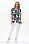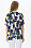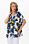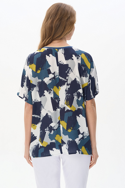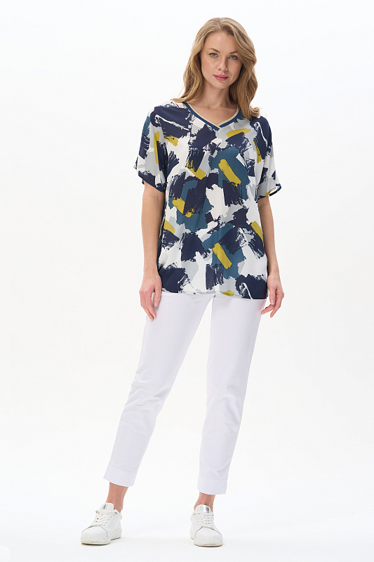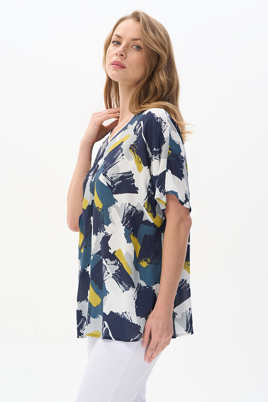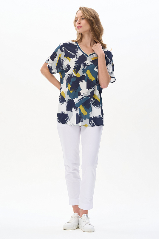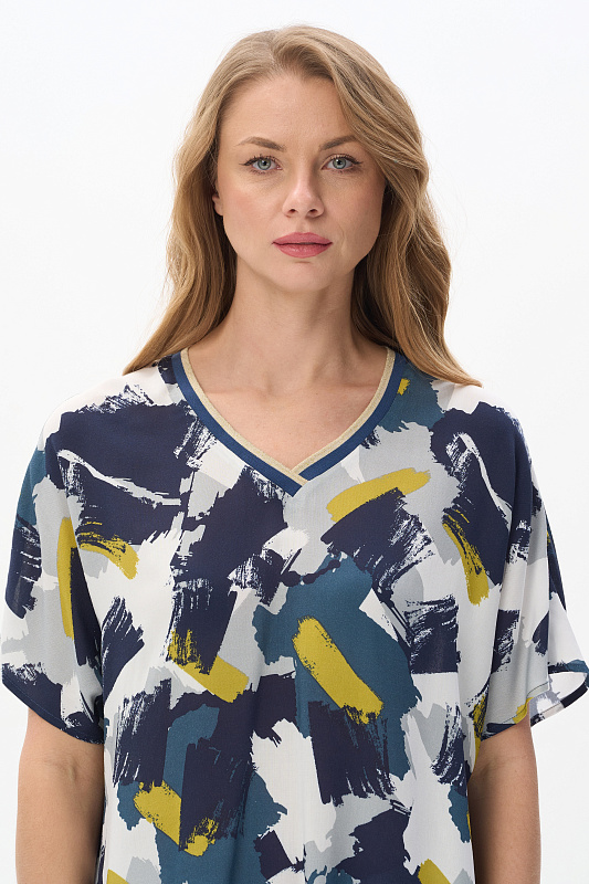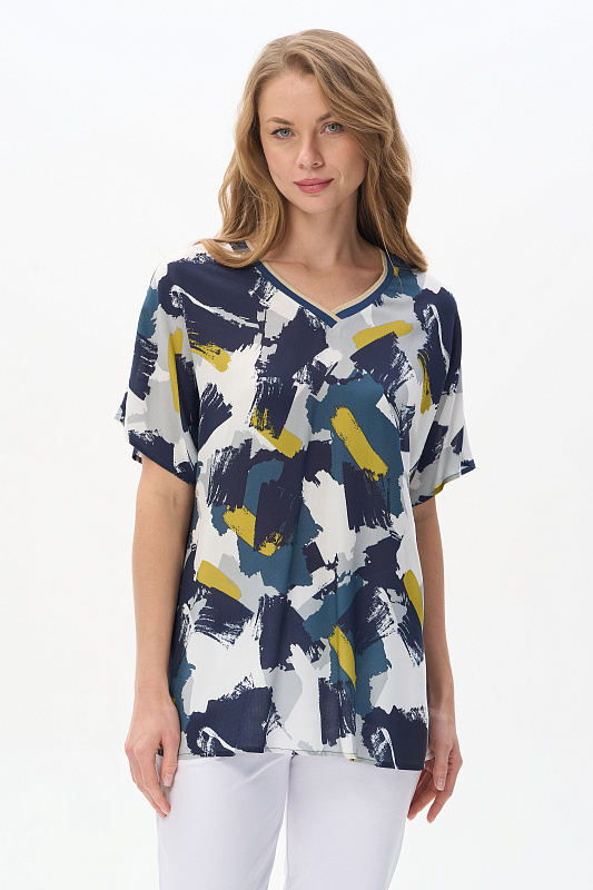 Блузка из штапеля 120 гр рисунок Яркая абстракция. Модель свободная, расширенного силуэта, спущенная линия плеча и короткие цельнокроеные рукава, V-образный вырез горловины обработан декоративной тесьмой в полоску с золотым блеском. Лёгкая, комфортная блузка для повседневных и нарядных образов. Рост модели 175 см.