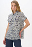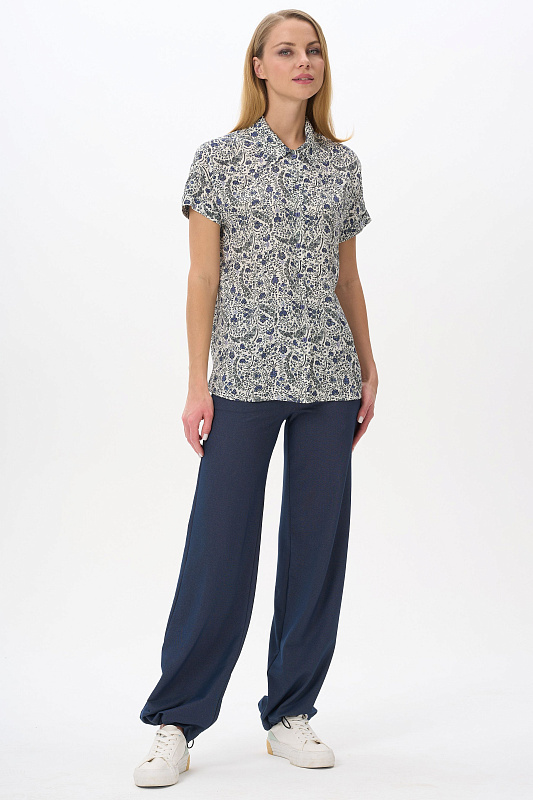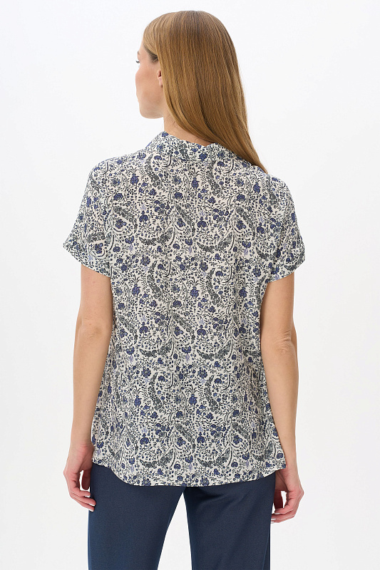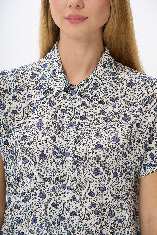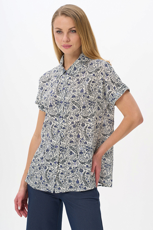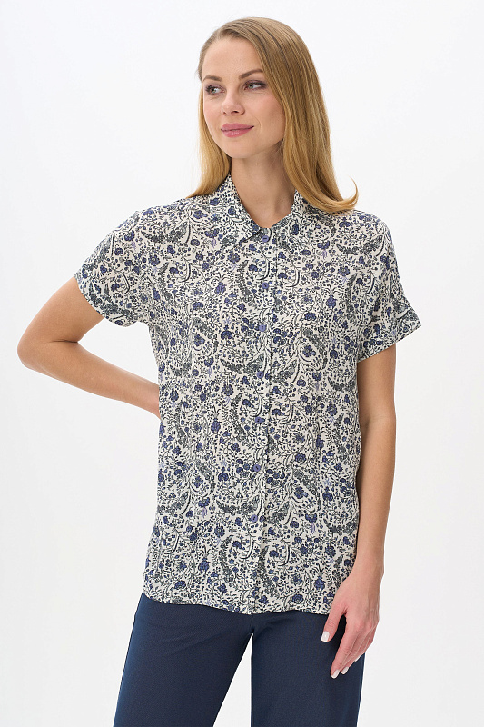 Блузка из штапельной вискозной ткани 120 гр. Растительный рисунок в серо-синих оттенках. Модель свободная, прямого силуэта, с отложным воротником, цельнокроеные короткие рукава с зафиксированным подворотом, застёжка на пуговицы. Стильная свободная летняя блузка - отличный вариант для офиса, города, прогулок. В комплекте с брюками из той же ткани создают прекрасный вариант для летнего гардероба. Рост модели 175 см.