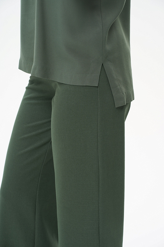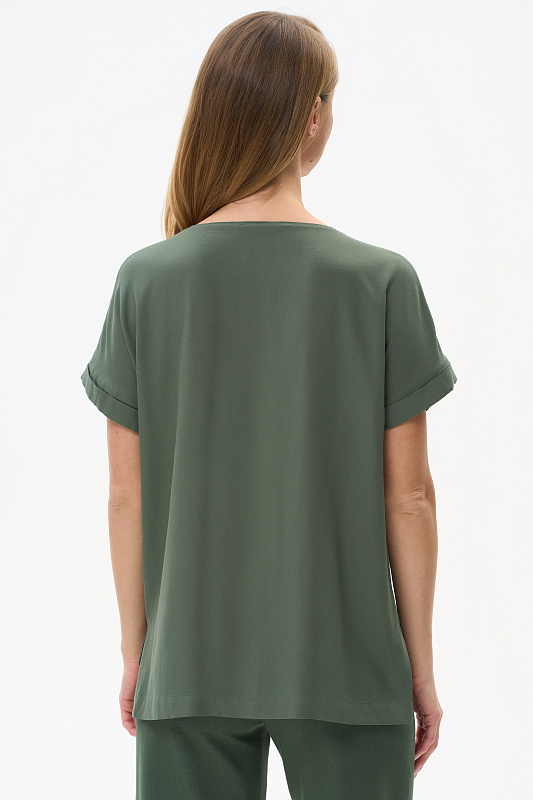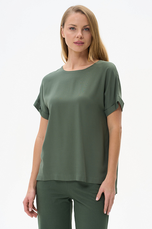 Блузка из штапельной вискозной ткани 155 гр, мягкая, с бархатистым эффектом, тактильно приятная, в оттенке тёмно-зелёный. Модель с круглым вырезом горловины, цельнокроеные короткие рукава с зафиксированным подворотом, модный неровный низ. Свободная, комфортная блузка для повседневных и нарядных образов. Рост модели 175 см.