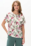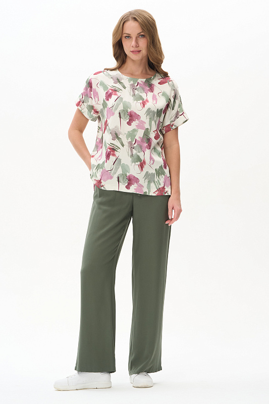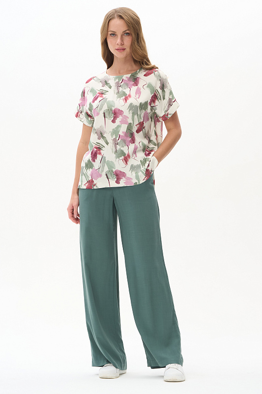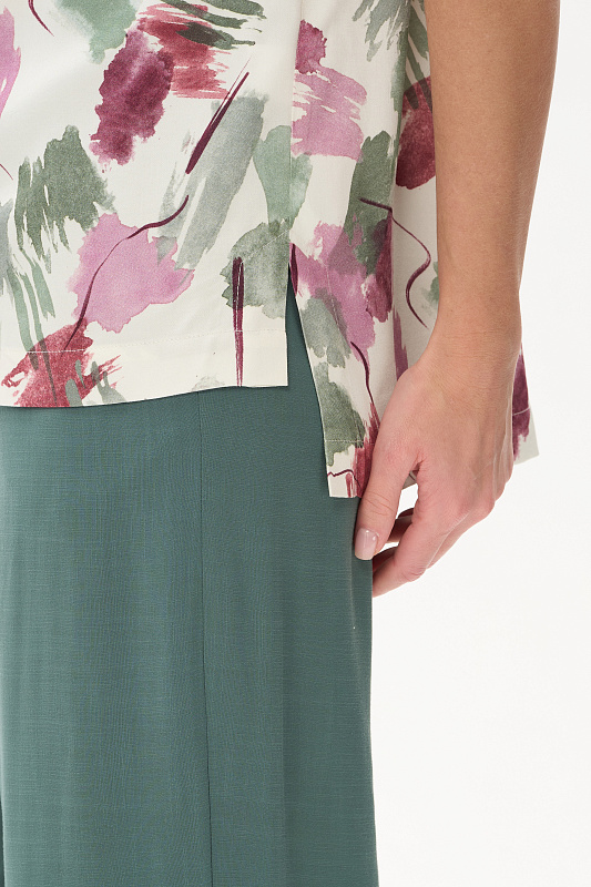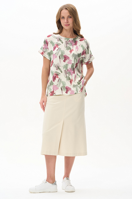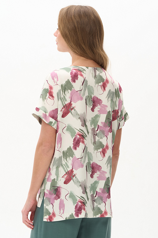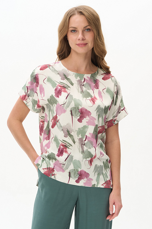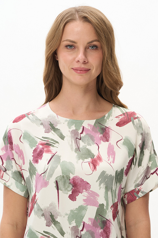 Блузка из легкой штапельной ткани 120 гр с Абстрактным рисунком в оттенках коллекции. Модель с круглым вырезом горловины, цельнокроенные короткие рукава с зафиксированным подворотом, модный неровный низ. Свободная, комфортная блузка для повседневных и нарядных образов. Дизайнерский принт ткани выглядит свежо и актуально. Рост модели 175 см.