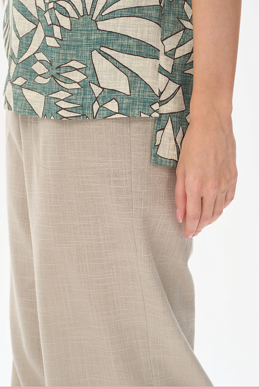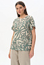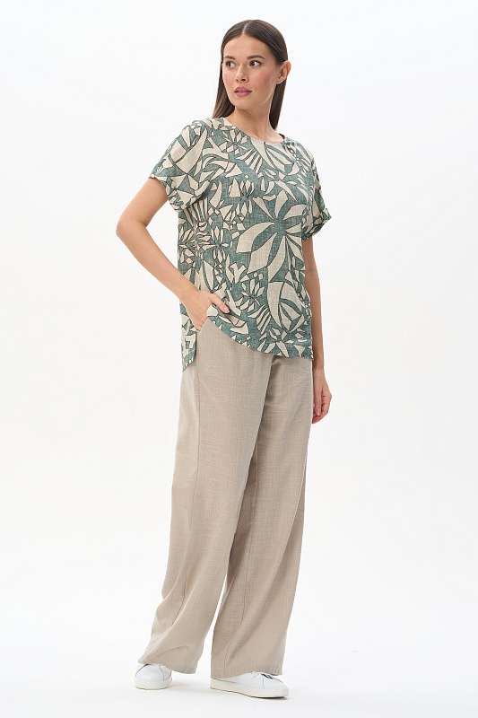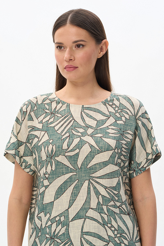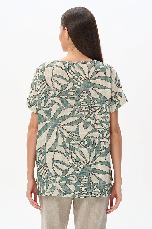 Блузка из легкой штапельной ткани 140 гр Абстрактный рисунок в оттенках коллекции. Модель с круглым вырезом горловины, цельнокроеные короткие рукава с зафиксированным подворотом, модный неровный низ. Свободная, комфортная блузка для повседневных и нарядных образов. Дизайнерский принт ткани выглядит динамично и актуально. Рост модели 175 см.